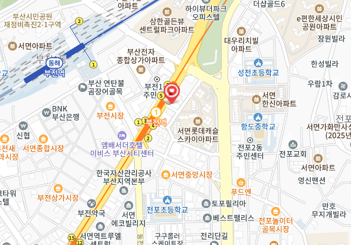 지하철 1호선 부전동역 하차 6번출구(양정쪽 끝부분 오른쪽 출구)