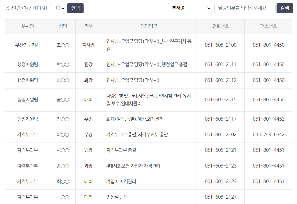 부서 연락처가 총 70건으로, 현재 건강보험공단 누리집에 소개되어 있습니다. 이후 부서 담당자 이름과 연락처에 변동이 있을 수 있습니다. 더 자세한 연락처는 아래 바로가기에서 확인해 주세요.